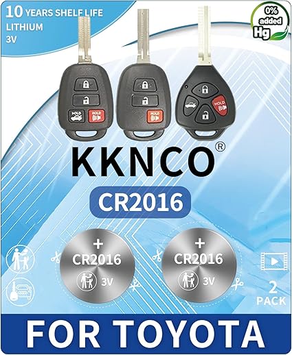 Specification Details Number of Batteries 2 CR2016 batteries Brand KKNCO Model Number CR2016 Toyota key fob batteries Included Tools 3 Open/Pry tools Instructional Material 1 Installation Video Card Warranty 2 Years Compatibility Traditional Toyota key heads only Customer Rating 4.5 out of 5 stars (53 reviews) ASIN B0D7H6G2TR