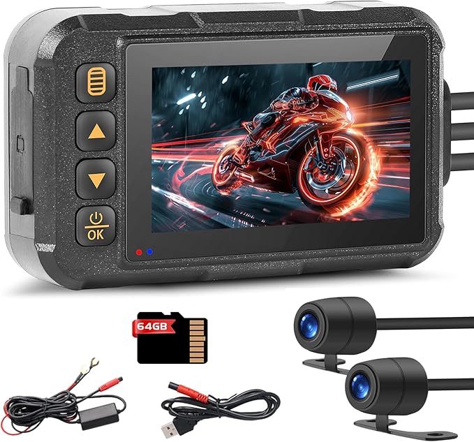 3. CAMECHO Motorcycle Dash Cam Front and Rear, IP67 Waterpoorf Dual