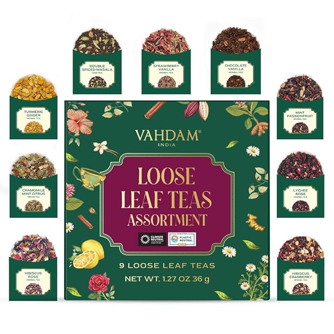 Discover a world of exquisite flavors with the VAHDAM Top 9 Exotic Loose Leaf Tea Sampler. This collection offers a luxurious experience, featuring carefully selected herbal, green, and chai teas.